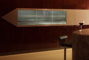 “I chose the wood as the defining texture that sets the tone for the interior,” explained Konieczny, who crafted the shelving himself.