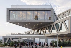 The 51,850-square-metre building will have a gridded timber facade and large windows, as well as a walkable green roof. Inside will be Olympic-standard swimming pools, alongside family and learning pools, sports halls, a gym, and outdoor facilities.